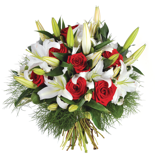 Dieser raffinierte Strauß besteht aus weißen orientalischen Lilien (oder einer anderen Sorte) und roten Rosen mit zartem Laub. Die Weiß- und Rottöne verleihen diesem runden Strauß Eleganz und Ausgewogenheit.