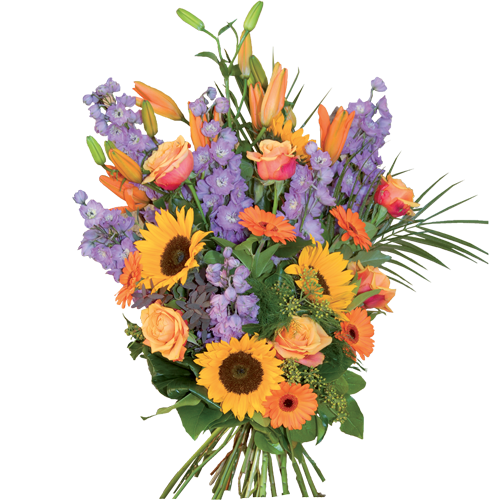 Blumenstrauß aus orangefarbenen Lilien, orangefarbenen Gerbera, Sonnenblumen (kann durch gelbe Gerbera ersetzt werden), violetten Löwenmäulchen und verschiedenen Blättern. Die ausgewogene Mischung aus Orange- und Violetttönen verleiht diesem Strauß Harmonie und Zartheit. Sie können einen Wasserspender hinzufügen, um die Blumen besser zu halten und eine Botschaft der Verbundenheit zu vermitteln.