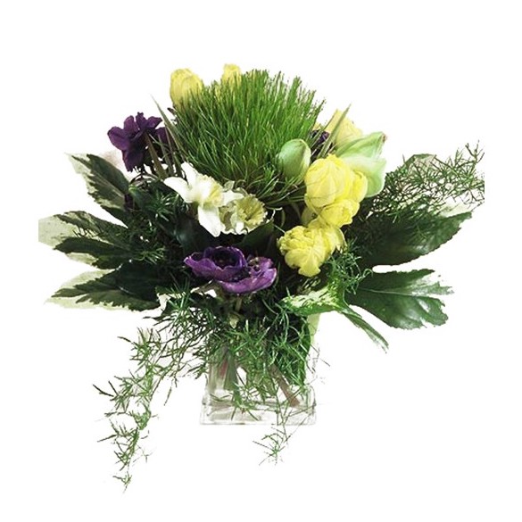 Hübscher, runder Strauß aus Anemonen (außerhalb der Saison kann Lysianthus verwendet werden), Tulpen und Blattwerk (Spargel, Papyrus usw.). Gelbe und violette Akzente verleihen diesem rustikalen Arrangement einen leuchtenden Look. Eine Vase ist nicht im Lieferumfang enthalten. Sie können dem Strauß eine Wasserblase hinzufügen und eine persönliche Beileidsbekundung hinzufügen.
