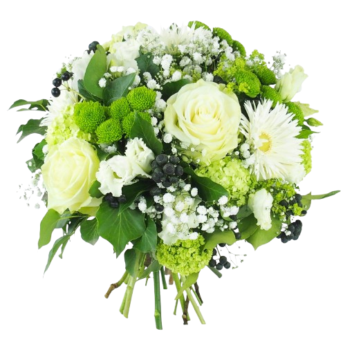 Ein runder Strauß in Weiß- und Grüntönen. Er besteht aus Rosen, Santini, Gerbebra (oder Germini), Schleierkraut, Lisianthus, saisonalen Beeren und Blattwerk. Der Strauß wird mit einem natürlichen Bastband zusammengehalten. Die Blumensorten können je nach Saison und Verfügbarkeit im Geschäft variieren, wobei die Harmonie der Farben und der Charakter dieses Straußes erhalten bleiben.