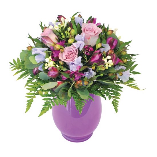 Ein Trauerstrauß in Rosa- und Mauvetönen für eine liebevolle Trauerbekundung. Er besteht aus rosa Rosen, malvenfarbenen Inkalilien und Freesien sowie weißen Bouvardien in einem Nest aus Eukalyptus und Farn. Vase nicht im Lieferumfang enthalten. Erhältlich in drei Größen. Schreiben Sie eine Nachricht Ihrer Wahl, die zusammen mit dem Gesteck an die Familie überreicht wird.