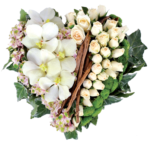 Herzförmiges Trauerkissen aus grünen Santini, weißen Vanda-Orchideen (kann durch andere Blumenarten wie weiße Hortensien ersetzt werden), rosa Hortensien (kann durch Freesien oder andere zarte Blumen ersetzt werden), weißen Sprayrosen und Efeu.