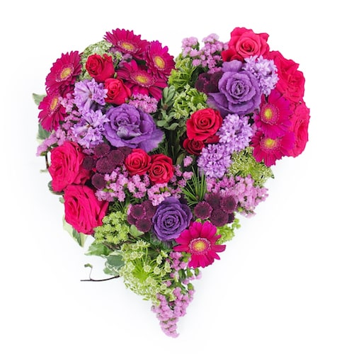 Ein herzförmiges Trauergesteck in Fuchsia- und Mauvetönen. Dieses Trauerherz besteht aus Rosen, Kohl, Santinis, Gerbera (oder Germinis), kleinen Blumen und Blattwerk.