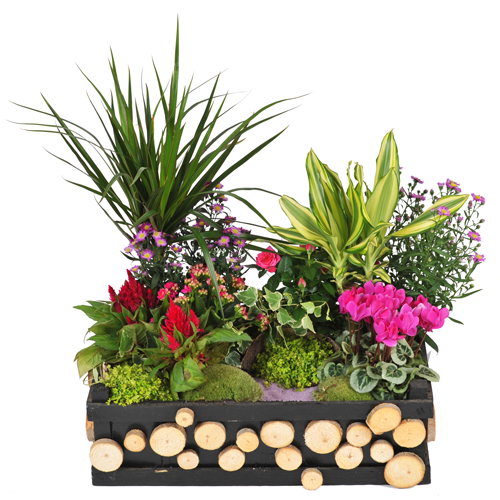 Komposition aus einem dunkelgrünen Drachenbaumstamm, einer zartgrünen Drachenbaumpflanze, einer violetten Aster, einem violetten Alpenveilchen, einem violetten Mini-Rosenstrauch, zwei Celosias (eine violett, eine violett), einer violetten Kalanchoe, einem kleinen Efeu und violettem Kies (der durch Sand oder Sisal ersetzt werden kann). Das Ganze ist in einer rechteckigen schwarzen Holzkiste mit Holzscheiben untergebracht (der Behälter kann je nach Verfügbarkeit im Handel durch einen Korb oder Keramik ersetzt werden).