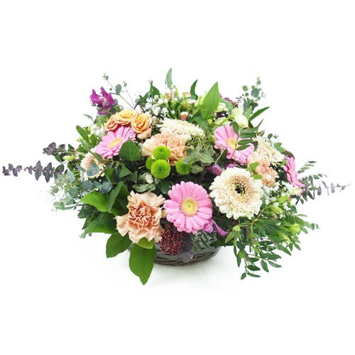 Ein rustikales Arrangement aus gestochenen Blumen in Rosa- und Lachstönen. Es besteht aus Rosen, Gerbera (oder Germinis), Nelken, Santinis, verschiedenen Saisonblumen und rustikalem Laub.