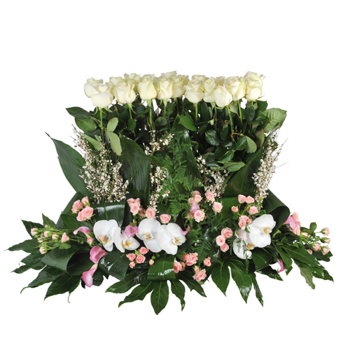 Ein raffiniertes Blumenarrangement in origineller Form mit weißen Rosen, weißem Ginster, weißen Phalaenopsis-Orchideen, rosa Mini-Nelken (oder kleinen rosa Rosen), Aralienzweigen und/oder anderem Grün rundet das Gesamtbild ab. Verzieren Sie Ihr Arrangement mit einer Schleife und zeigen Sie Ihre Unterstützung mit einer persönlichen Nachricht.