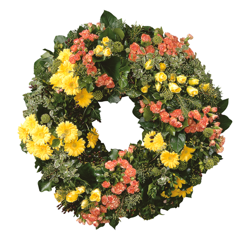 Dieser Trauerkranz ist eine perfekte Balance zwischen Orange, Gelb und Grün. Er kombiniert rosa Mini-Nelken, gelbe Gerbera, gelbe Rosen, Pitosporum und Efeukugeln (80 cm Durchmesser).