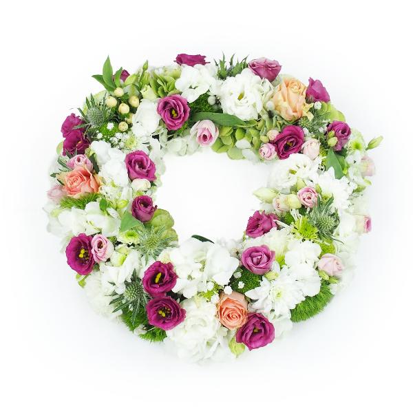Kleiner Kranz aus festgesteckten Blumen für Beerdigungen in Rosa-, Weiß- und Mauvetönen. Er besteht aus Rosen, Hortensien (je nach Jahreszeit), Lisianthus, Nelken, Johanniskraut, Santinis, saisonalen Blumen und verschiedenem Blattwerk.