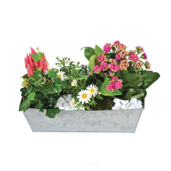 Kleiner Pflanztopf für das Grab. Er enthält weiße Anthemis, rosa Celosias und Kalencloa, umrahmt von Efeu. Ein paar weiße Kieselsteine ergänzen den rechteckigen Behälter (je nach Lagerbestand anpassbar). Fügen Sie eine Beileidsbekundung hinzu, um die Familie zu unterstützen und Ihr Geschenk zu personalisieren.