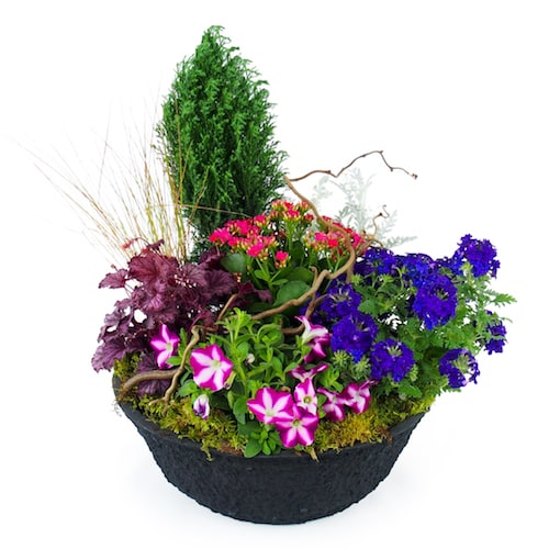 Ein Arrangement aus grünen und blühenden Pflanzen in Rosa-, Mauve-, Blau- und Grüntönen. Es besteht aus einer Konifere, einer Kalanchoe, einer Petunie und verschiedenen Grünpflanzen. Die Pflanzen sind mit Moos bewachsen, während ein Holzzweig als natürliche Dekoration dient. Das Arrangement befindet sich in einem schwarzen Behälter, dessen Farbe und Material je nach Verfügbarkeit im Geschäft variieren können. Die Blumensorten können je nach Saison und Verfügbarkeit im Geschäft variieren, wobei ein harmonischer Ton und eine harmonische Atmosphäre erhalten bleiben.