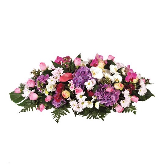 Ein farbenfroher Strauß in Flieder- und Weißtönen, bestehend aus roten Anthurien, weißen Refours und rosa Rosen. Lila Hortensienblüten sorgen für Abwechslung in diesem Arrangement, das durch weiße Phalaenopsis, Philo-Blätter und Farne akzentuiert wird. Dieses Produkt ist in drei Größen erhältlich. Fügen Sie eine Beileidsbekundung hinzu, um Ihre Anteilnahme an die Familie auszudrücken.